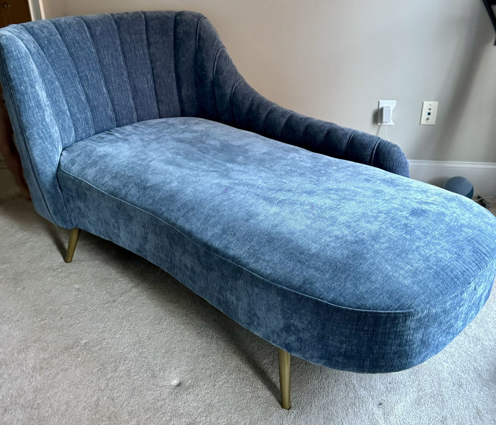 Like new. High quality. Minimal use mostly for decor. Beautiful blue. Super comfortable and easy clean fabric. Dimensions: 77”L x 32 W x 8” height from floor to seat.