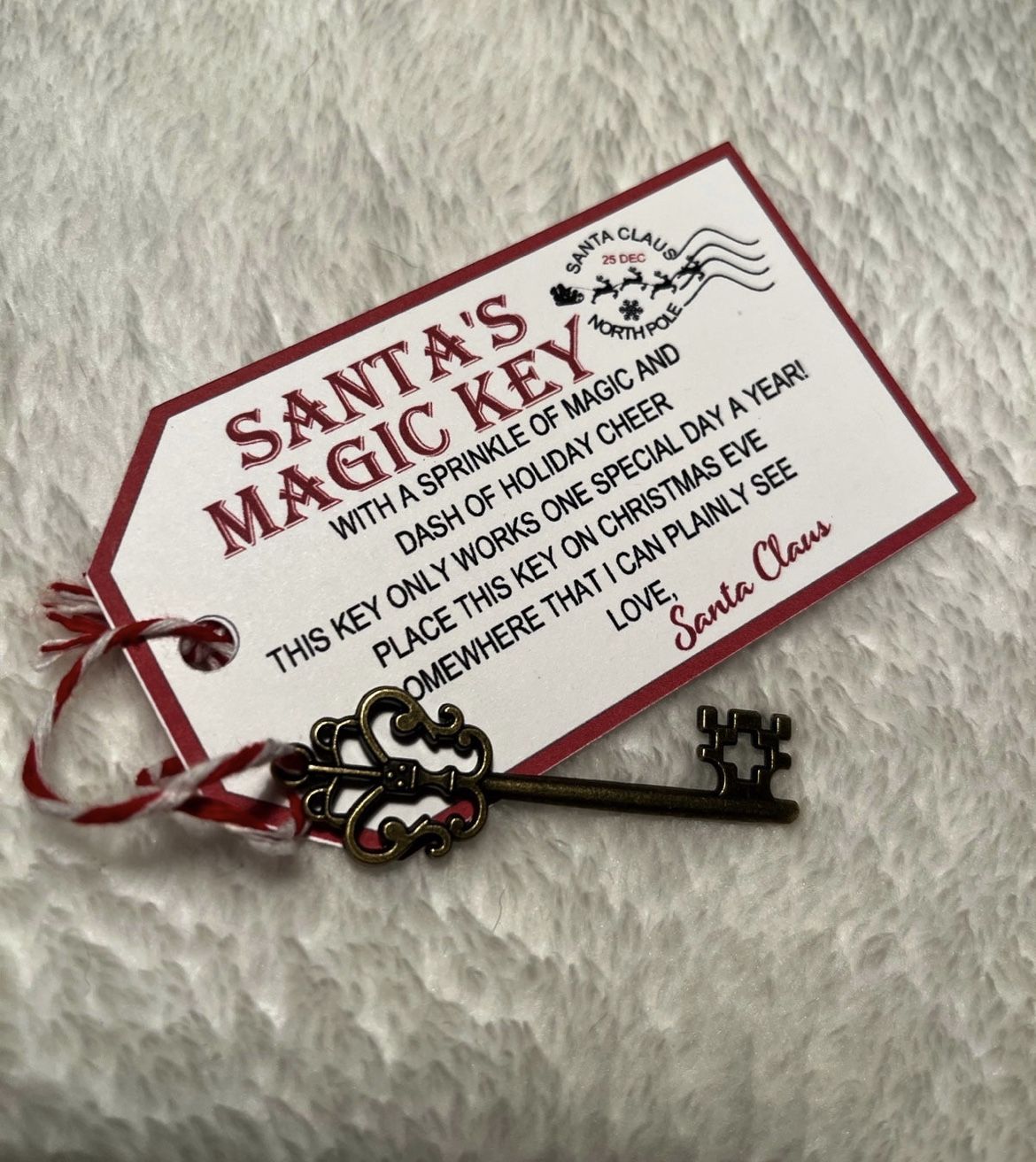This Santa Key is the perfect gift from Santa for those who don't have Chimney's this Christmas Eve. The Magical Key allows Santa to enter and exit through the front door, and the best part, is no one else can use it without Santa's Magic! Includes one tag and one bronze key (key styles vary)