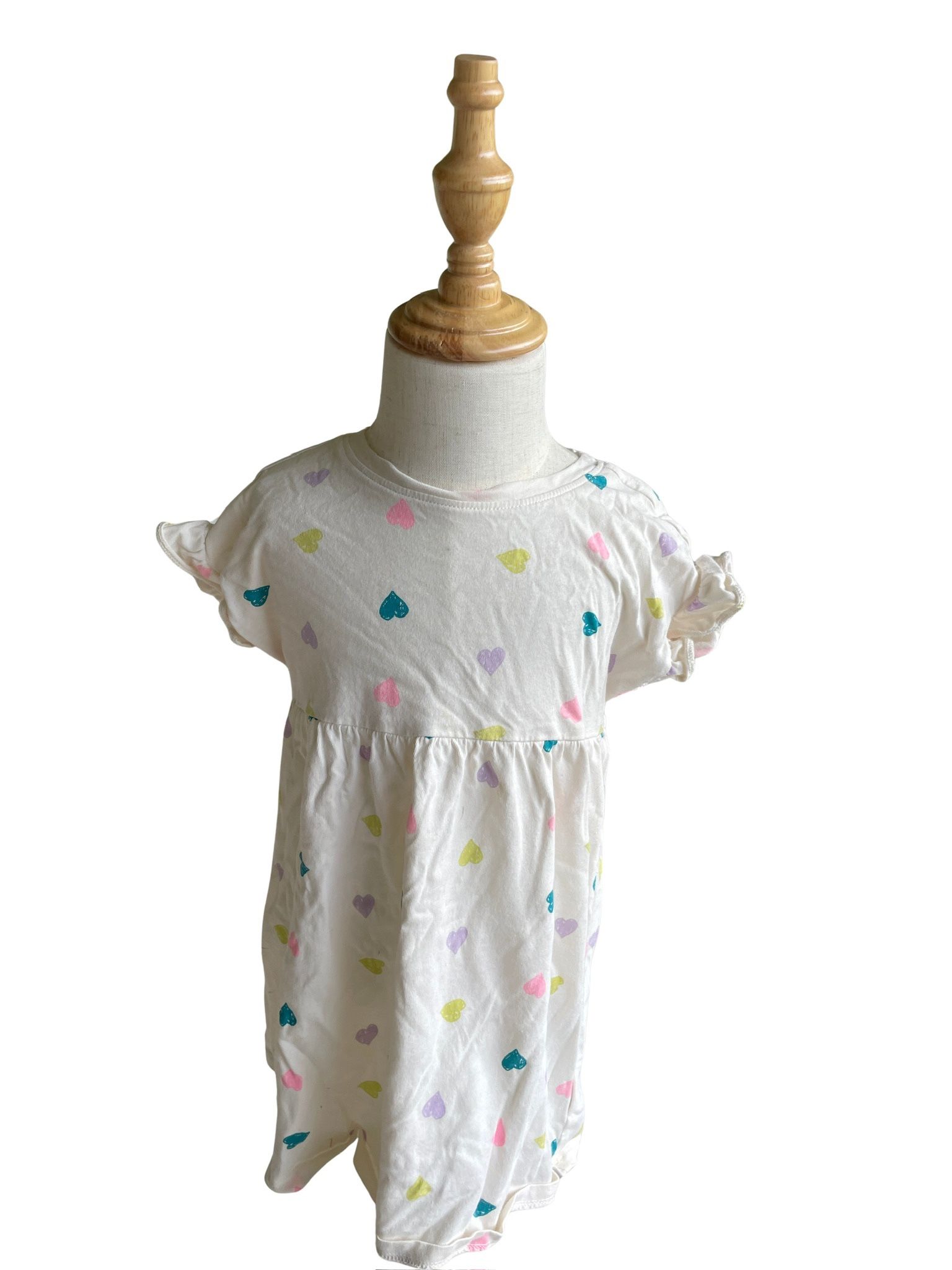Soft white short sleeve dress with scattered heart print. Features ruffled cap sleeves and an empire waist. Cute multicolor hearts in teal, pink, purple, and yellow. Perfect everyday dress for little ones.