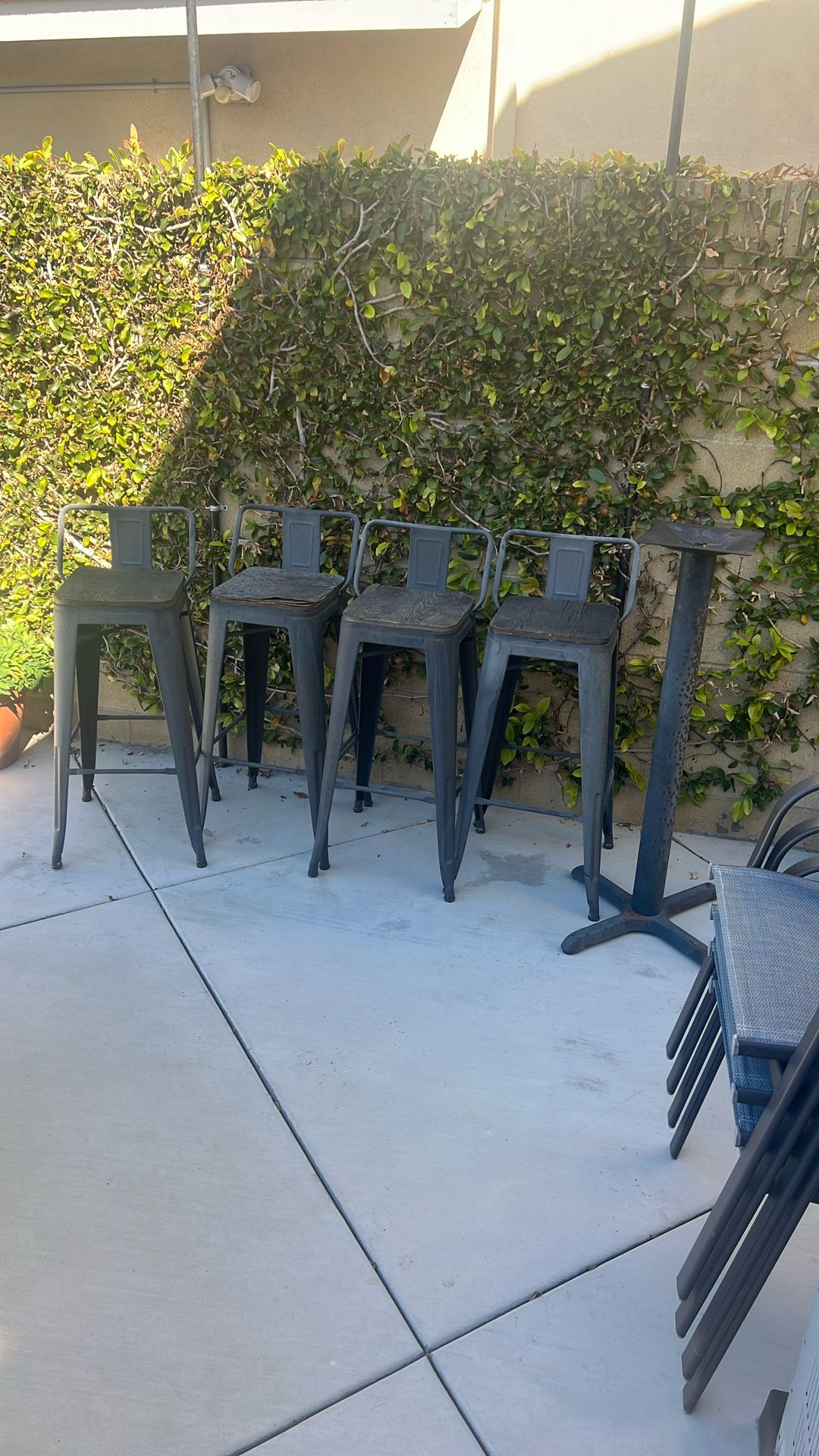 4 black metal bar stools with a low back. Wood seating that needs to either be replaced or repaired. Also, a black metal base to add table top to. The metal chairs and table base are just in need of a new paint job.