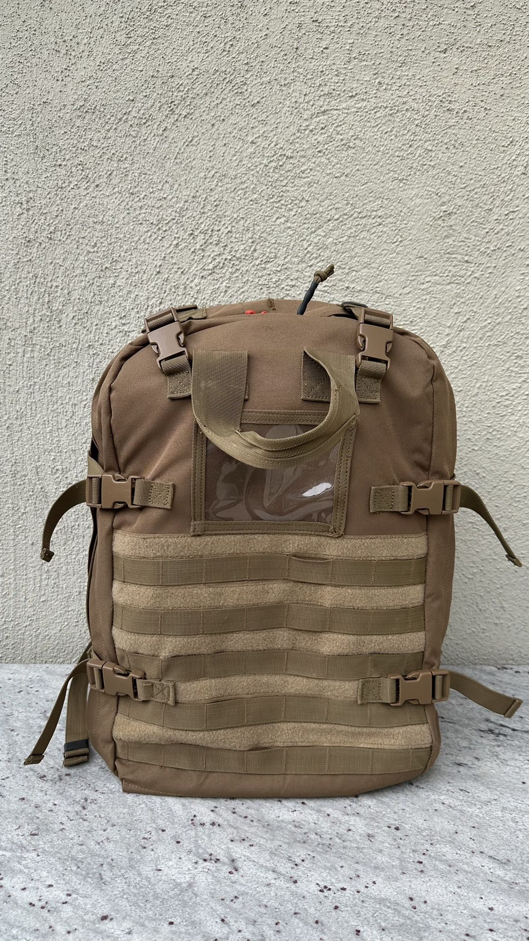 Tactical medical kit backpack. Lots of pockets and built in pouches as you can see in the pictures. All zippers work perfectly. All zipper pulls were replaced for easier operation. If you like to jump out of planes, this backpack is jump compatible. No tears or rips or fraying. Excellent condition.