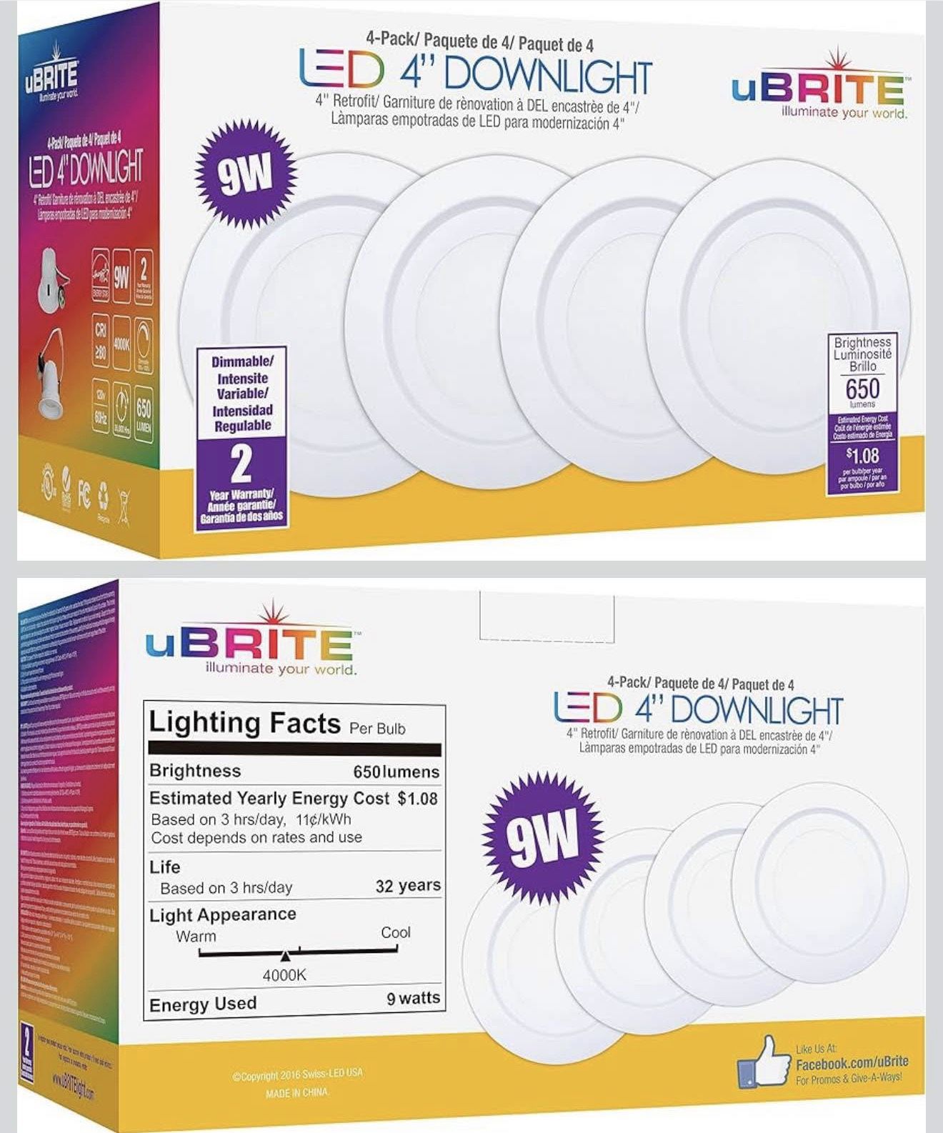 UBRITE LED UBDLD494KW4 Retro Fit LED 4000K DOWNLIGHTS (4 Pack) 4" 20 boxes available