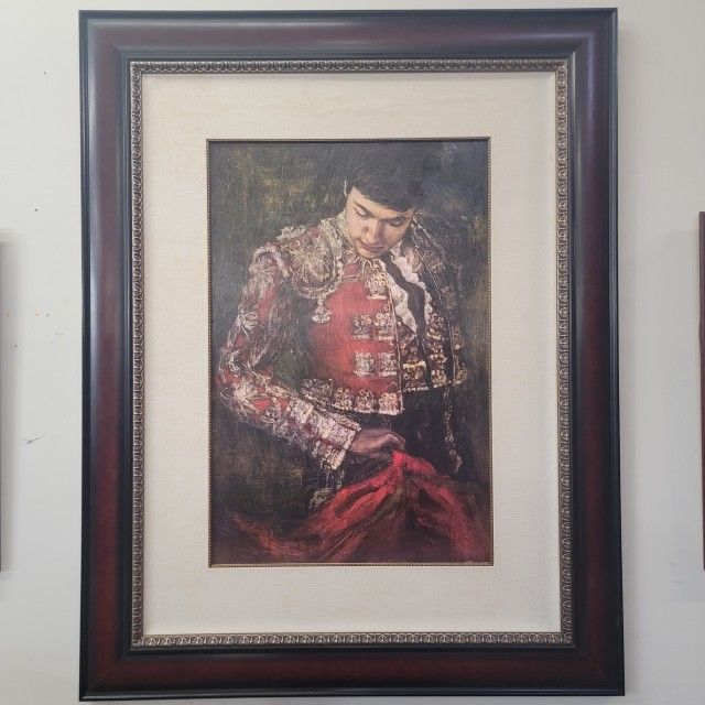 47.5″ W × 60.5″ H On view at Design Consignment Gallery. A large-scale framed figurative painting with rich texture and restrained intensity, offering a quiet, confident presence that anchors a wall without overwhelming it.