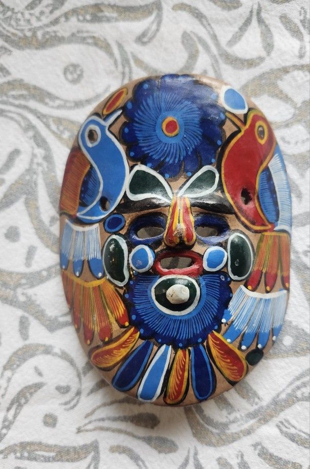 Interesting piece from New Mexico Small hand painted mask 5 1/2in tall by 4 1/2 in. Can hang or put on a stand for display.