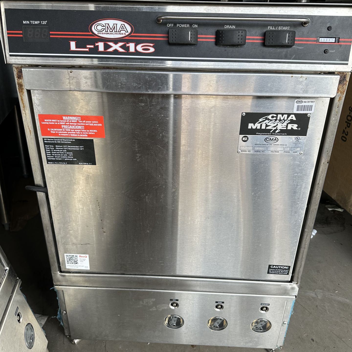 UL Listed CMA model L-1X16 115v single phase - 16amp 24” wide x 35” tall Gently used commercial dish machine/glass washer for restaurants and bars We have 6 machines for sale. Original purchase price was $4200 per unit. All units work and were used for about 12 months. Asking $2300 each obo