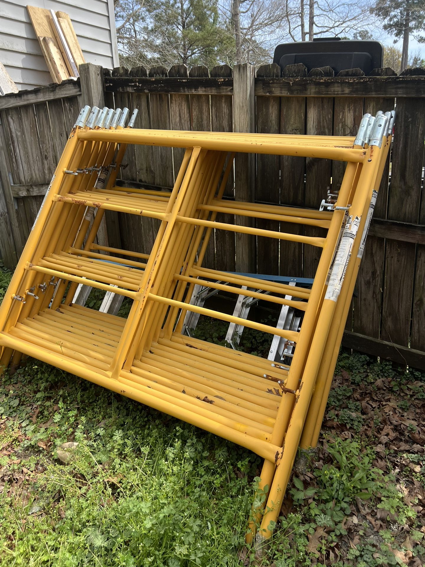 Scaffolding set. 6 complete sections. 6 walkboards. 8 adjustable feet. Used a few times.