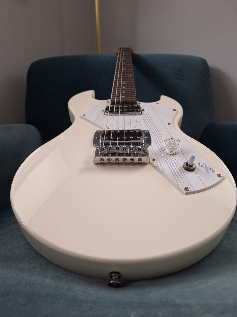 This visually stunning First Act Adam Levine Signature 222 electric guitar is a solid-body, 6-string rocker with a distinct SG-like double-cutaway design and cool art deco-like graphic pickguard. It features two First Act proprietary humbucking pickups that roar! Massive sustain too -- seriously. With a solid maple neck, rosewood fingerboard, and a 25.5" scale length, this guitar plays as good as it looks. A 3-way selector and single volume knob give you tonal options. Chrome die-cast tuners, a hardtail bridge and Adam Levine's signature on the truss rod cover round out the specs on this baddie. Very good condition. All finishes super clean. New Ernie Ball strings - 9s. Minor lacquer repair (pictured). Enjoy!