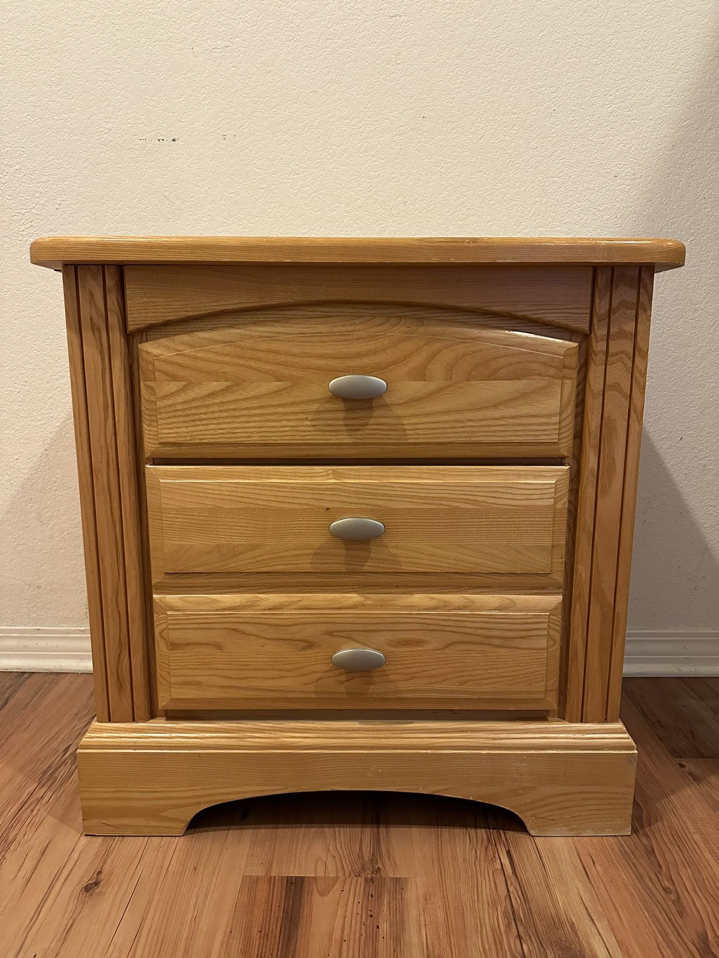 Heavy and quality made that is hard to find nowadays. Solid wood, light-colored stain. Both drawers work. Height: 27 inches Width: 27 inches Depth: 15.75 inches Cash only. You must come pick up. We are on the third floor of a condo but we DO have an elevator.