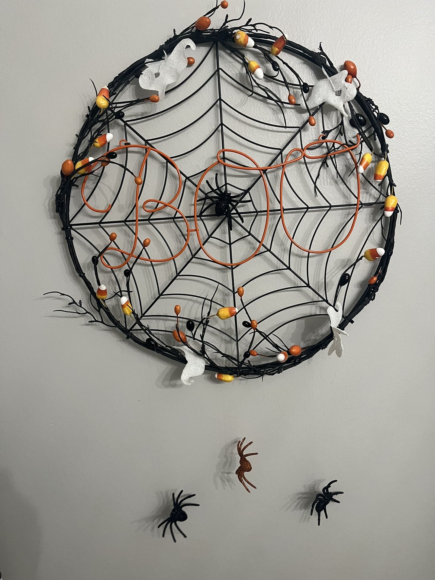 Unique wall art spider web (metal) and boo sing/wreath. Bordered with ghosts and faux candy corn. Size is roughly 17”