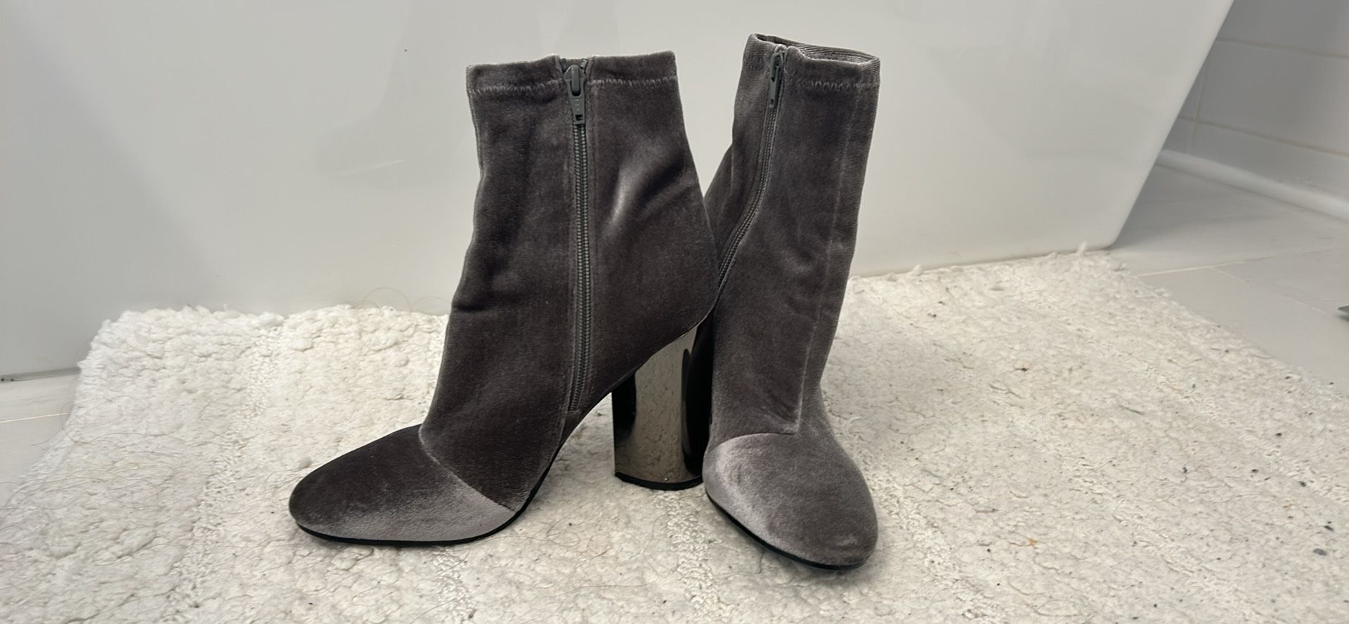 Beautiful never worn grey velvet bootie with sleek polished heel. Size 8. Local pick up and cash only. Asking $80 or best close offer. (priced $110)