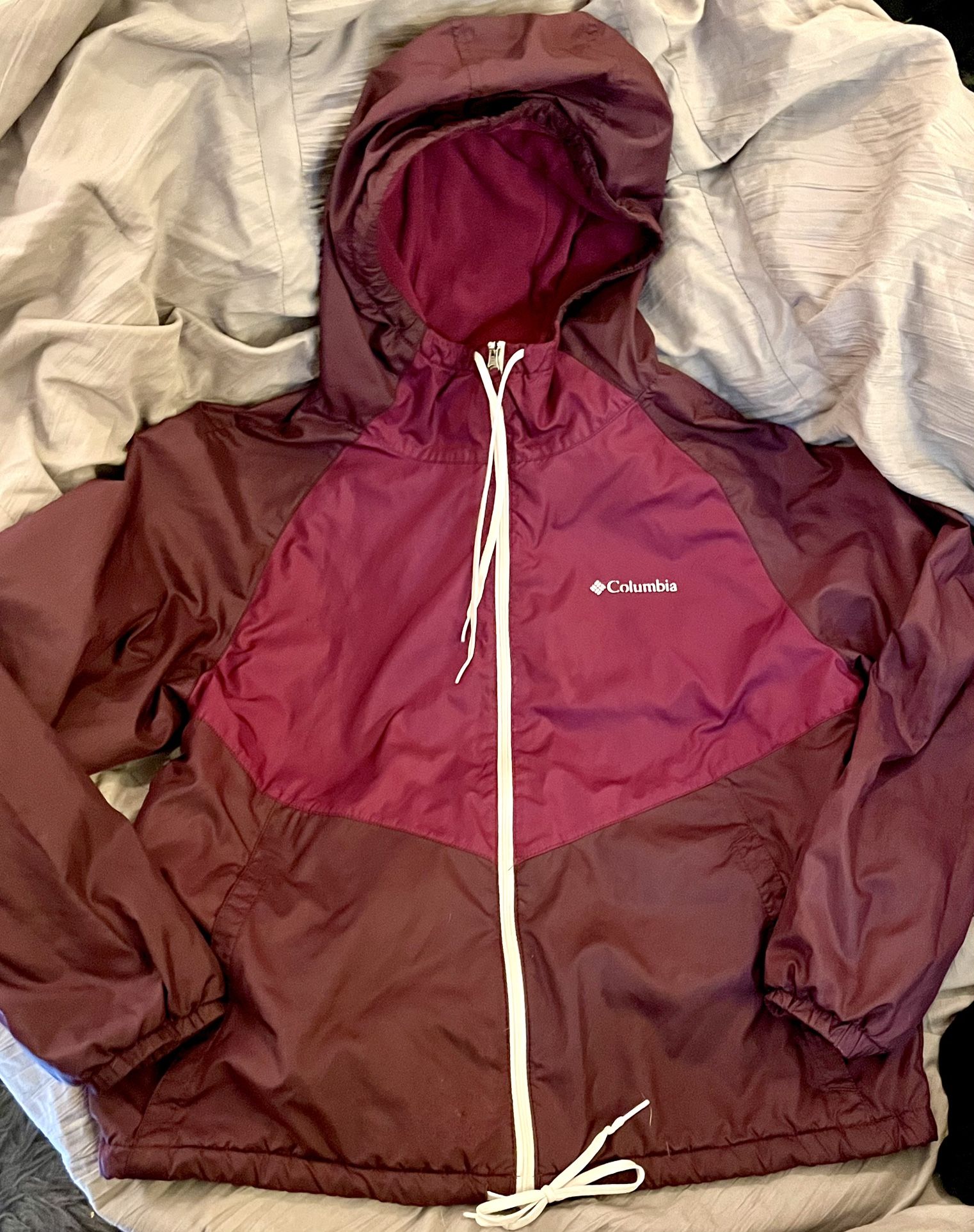 Women’s Columbia brand nylon windbreaker, outer material with super soft fleece inner material. Color is burgundy and pink with white accents/zippers and drawstrings. Size -adult medium. Excellent condition! Worn once.
