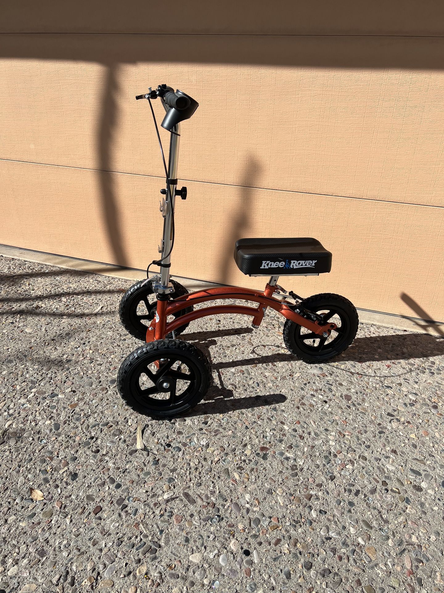KneeRover rehab scooter. Fully assembled, ready to go. This KneeRover is a new, open box item. Turns out I didn’t need it. It is very high quality and looks fantastic. The knee rest and handlebars are fully adjustable. Comes with the original box and the training wheel.