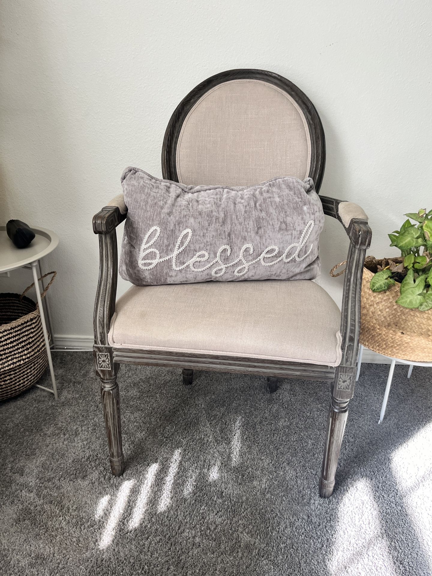 Very nice pair of antique chairs, and metal side tables, no stains no rips, and no smell very clean chairs, asking 80 Or best offer want to sell as a set but i’m okay parting with them individually, Plants not included.