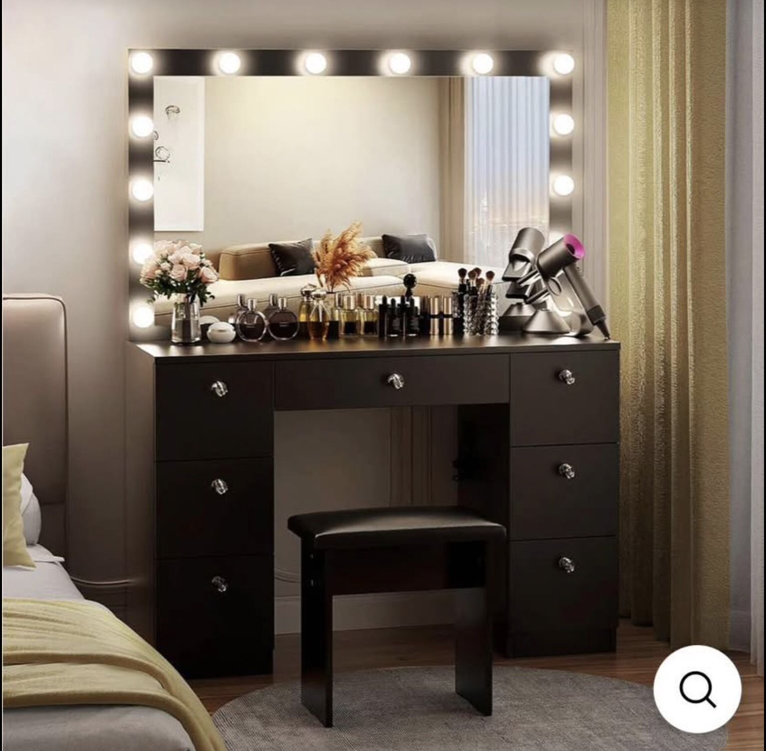 This vanity set includes a vanity table, a stool, a lighted mirror, and 7 drawers. This makeup table comes with a power outlet for charging. What I love most about this dresser is that it has an extra-large mirror, which is very convenient for checking your makeup and overall matching outfits. This extra-large mirror has 14 LED lights. The lights on this makeup vanity are very bright and come with 3 different settings: warm yellow, warm white, and cold white light colors. This vanity desk set with an LED light mirror has enough storage space to store your cosmetics, perfumes, makeup brushes, etc. This makeup table is made of MDF board, it's very strong and durable. PICK UP ONLY!!!! Brand new still in the box, never been opened OBO