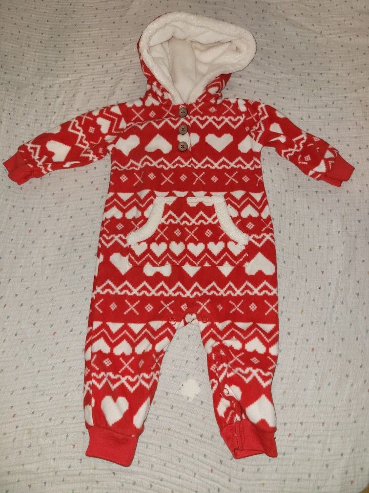 Carters brand size 6 month outfit. It's fleece with a hood, buttons on the legs for easy changing and near neck for easy to put on. Red, with heart print. Could be used for winter holidays like Christmas or valentines day. Super cute and super warm. Washed and worn once, sadly baby outgrew before the weather got cold. Think it's girls, but used it for my boy.