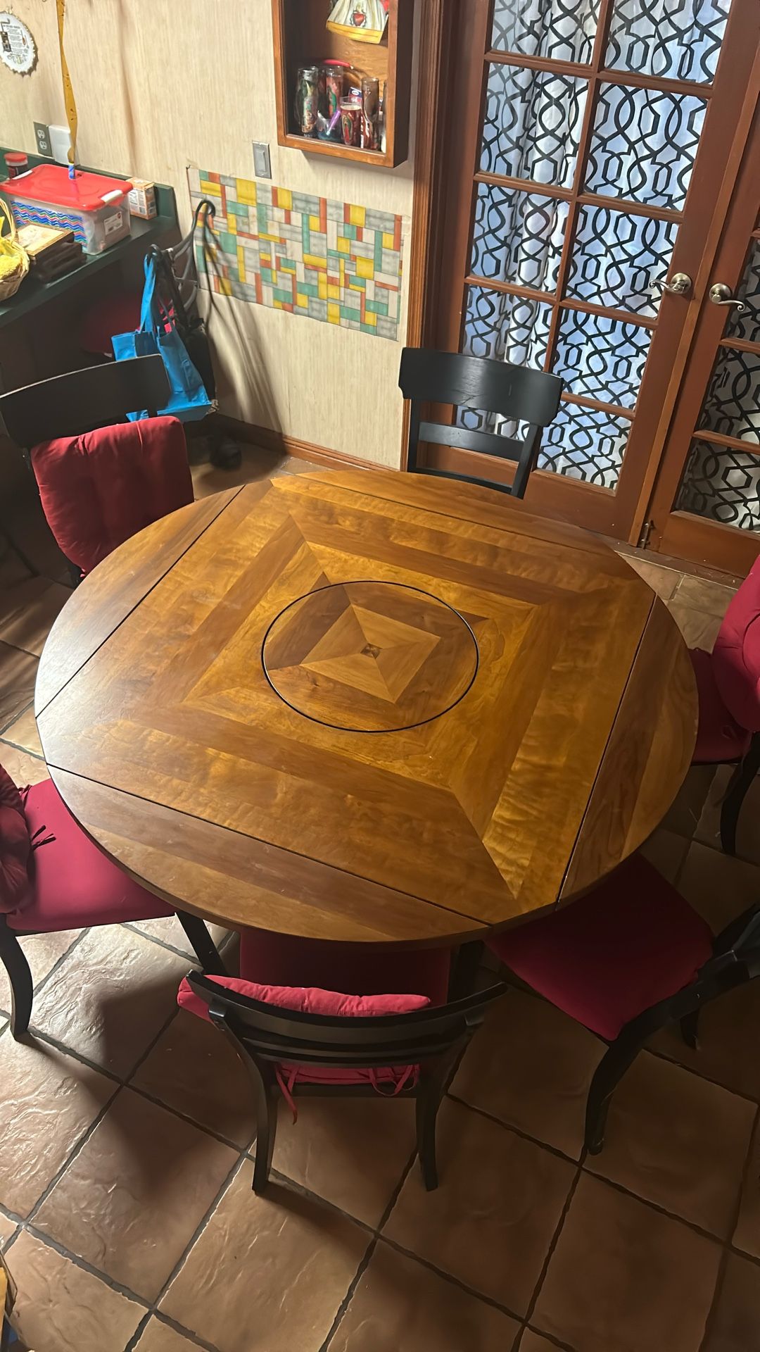 Table is in excellent condition, like new. Sides can fold up or down. Dimensions of table: Diameter = 5ft Height = 30.5 inches Dimensions of chairs: Height: 40 inches