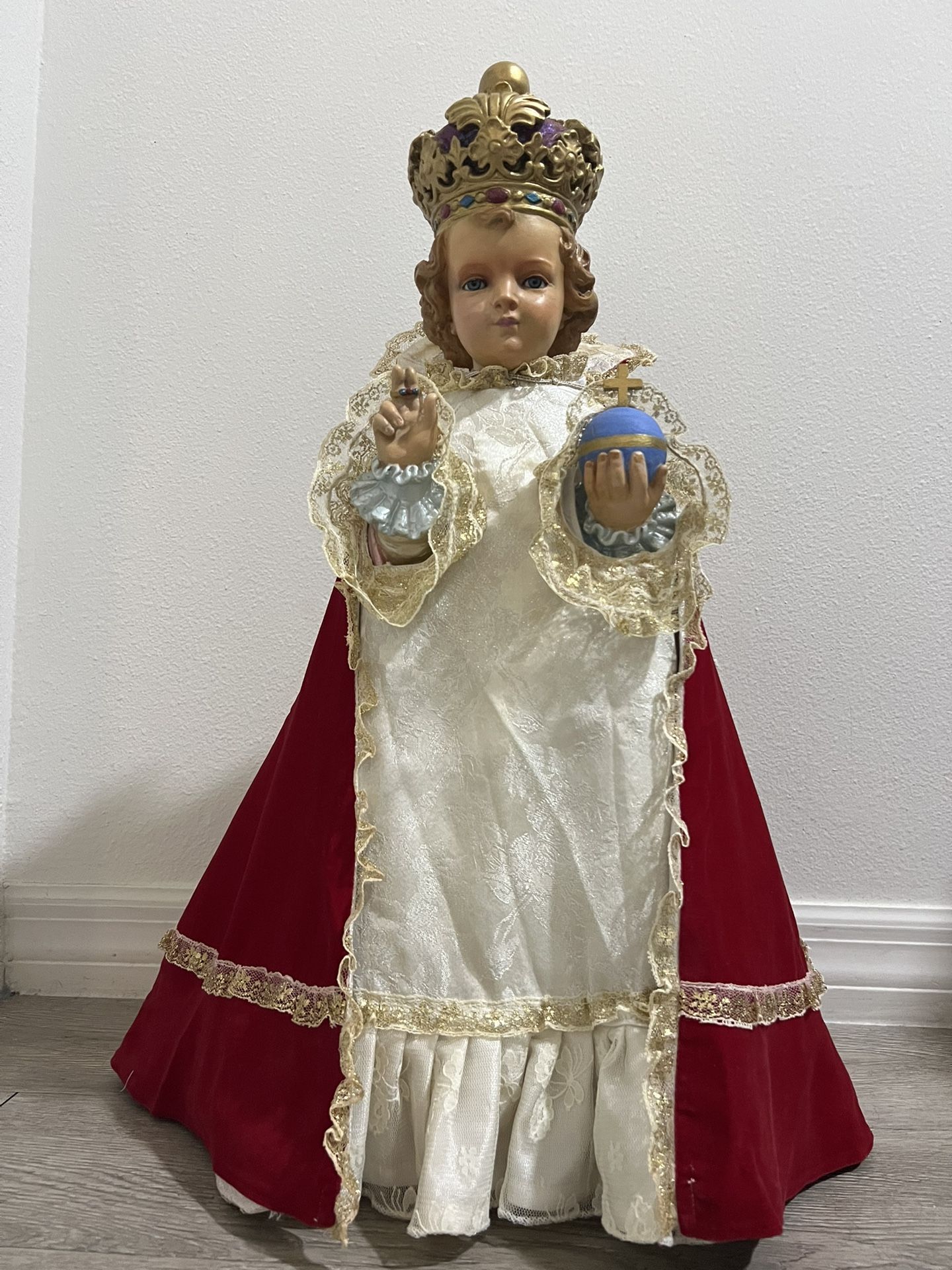 Niño de Praga Antiguo con ojos de vidrio , mide 23 inches . Comprado en Italia buenas condiciones