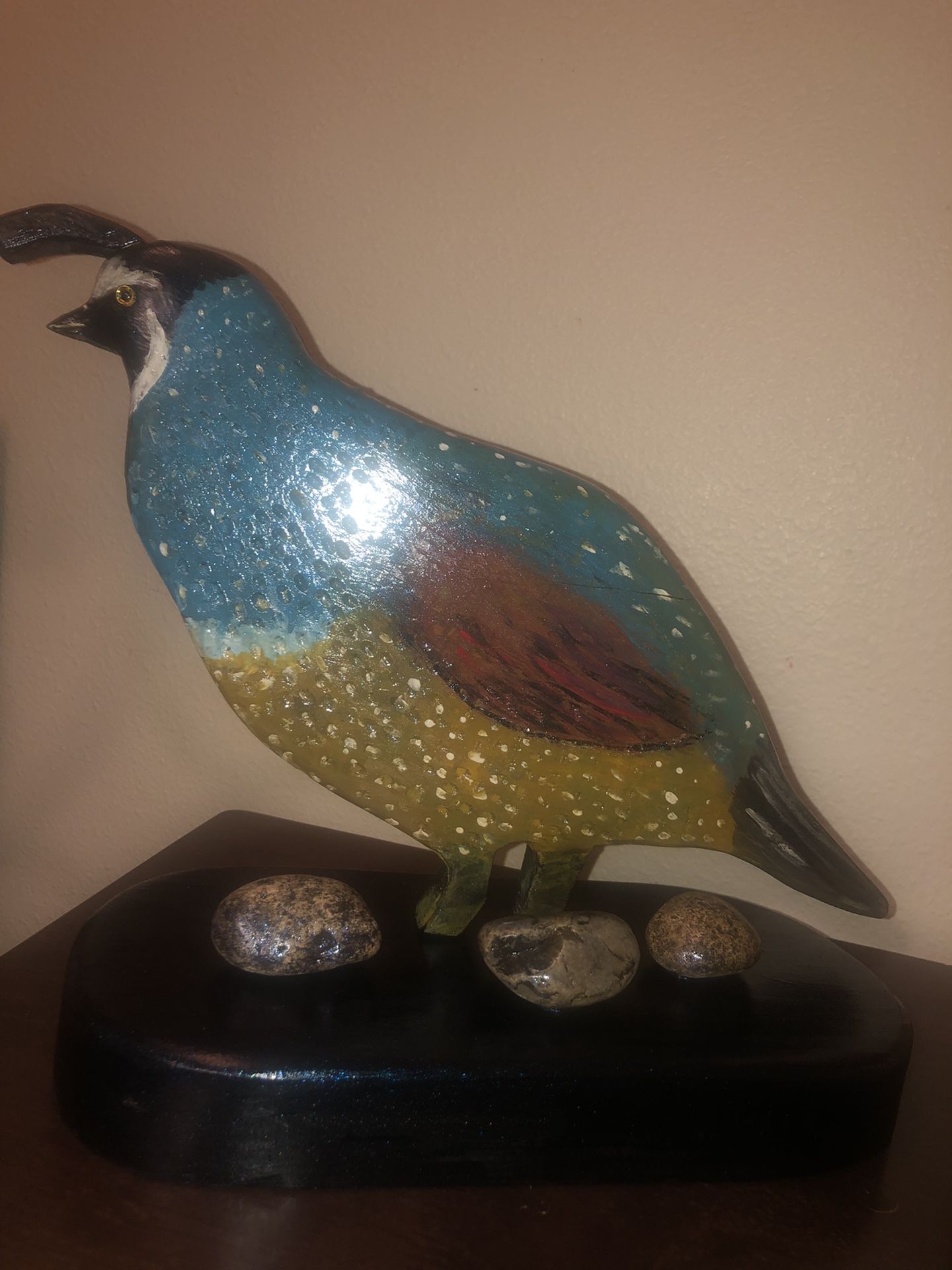 A pretty wooden quail sculpture. It measures 11 by 11 inches.