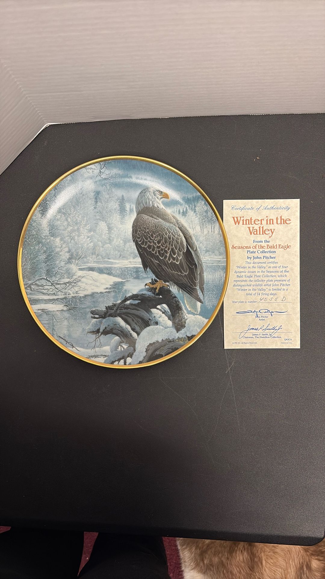 1990s "Winter in the Valley" collector plate by John Pitcher. Part of the "Seasons of the Bald Eagle" collection issued by The Hamilton Collection in 1991. It measures approx 9.25” in diameter and is accented with a 23K gold trim. The plate is for display purposes only and not for food use.
