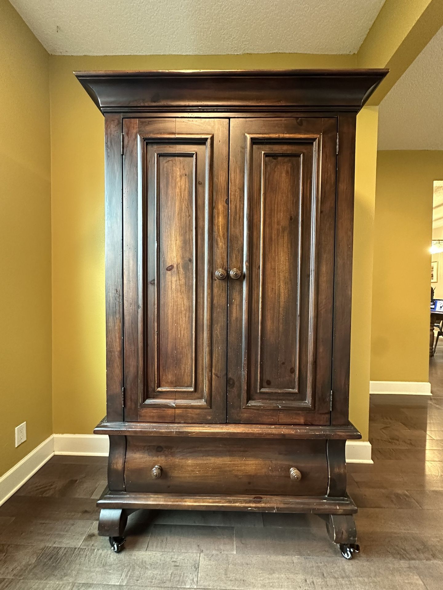 Dimensions: 48” W x 80” H x 24” D Upgrade your storage with this beautiful, solid wood standing armoire. This is a sturdy, high-quality piece—not flat-pack furniture! It’s incredibly versatile and works perfectly as a bedroom wardrobe, a pantry, or a TV cabinet. Features: • Storage: Includes a clothes hanging rod, one large bottom drawer, and one interior drawer. • Customizable Interior: Features a removable shelf (originally reinforced for a heavy TV, so it’s very strong). • Mobility: We’ve installed heavy-duty locking caster wheels to make moving it much easier. • Original Hardware: We still have the original levelers/feet hardware if you prefer the traditional look. • Condition: Good used condition with minor character wear. Important Pickup Details: • Weight: This is extremely heavy. * Requirement: You MUST bring at least two strong people and a truck/large van. I cannot assist with lifting. • Location: Eliot neighborhood in NE Portland First person who can confirm a pickup time gets it. No long-term holds.