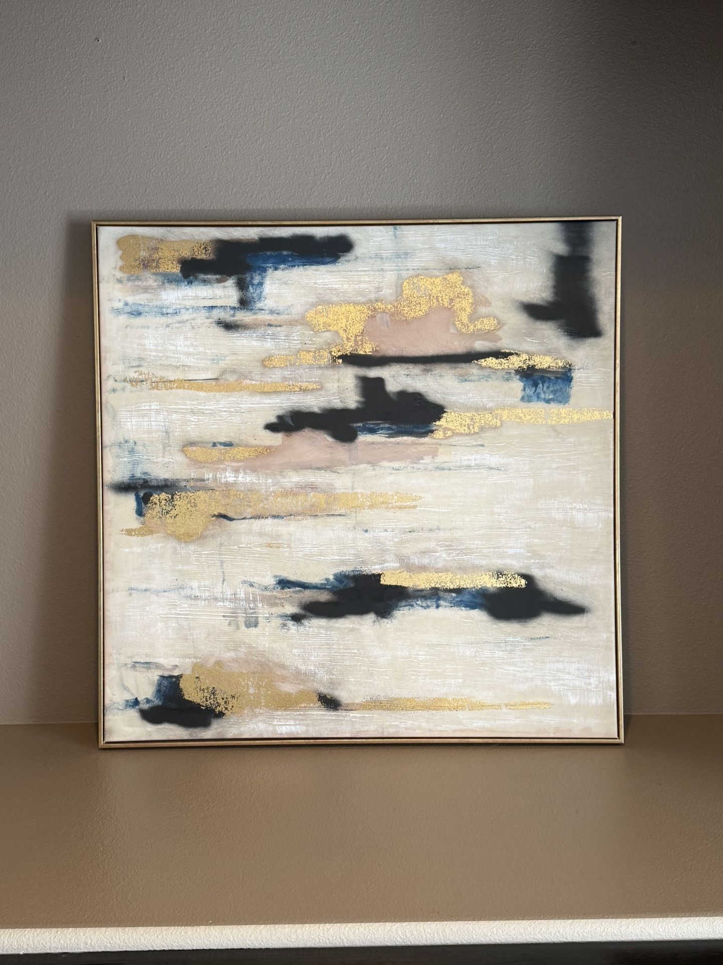 Modern abstract canvas wall art, 30” x 30”. Neutral palette with gold, navy, black, and white tones. Lightweight and easy to hang. Good condition. No damage. Pickup only. Selling reason: moving out of state, priced for quick sale