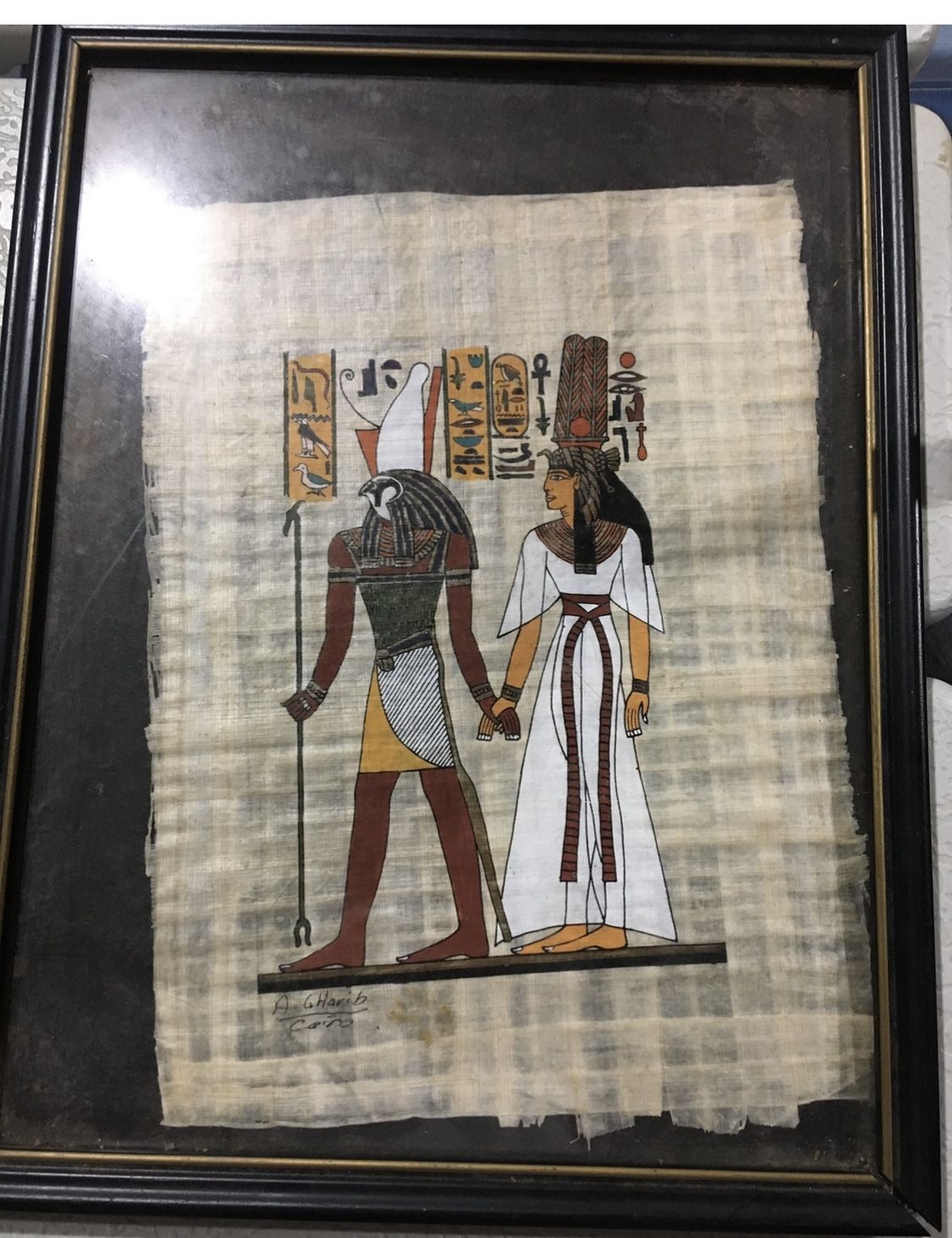 Authentic Egyptian painting on papyrus paper brought from Egypt Horus and Nefertiti Rare piece A. G Harib (Cairo) signature