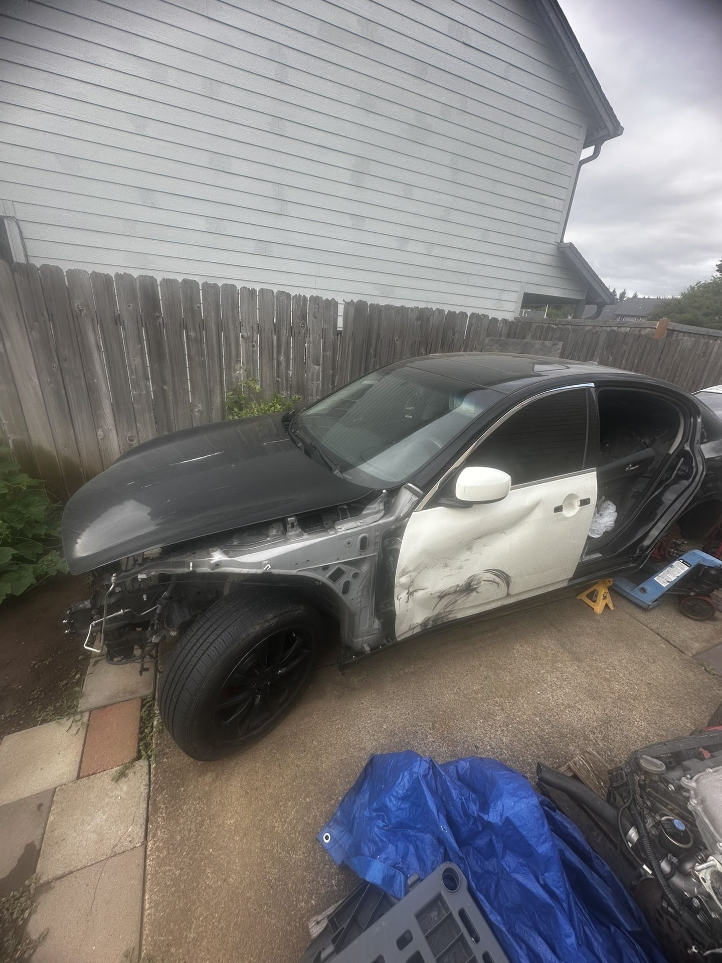 Parting out Black 08 G35X it has 154k miles but the motor is knocking due to valves still starts up. Parts that already have been sold please read carefully before asking me or messaging me. Both headlights sold Driver side mirror sold Driver/Passenger side fenders both sold trunk spoiler sold stock exhaust /Catalytic converters sold Intake manifold sold Rear bumper sold Front bumper sold Intakes sold Driver side door sold Complete radiator support with radiator and fans sold Awd differential carrier pumpkin with half drive shaft sold Rear passenger CV axle sold Rear passenger upper control arm sold Rear passenger lower control arm sold Driver and passenger seats both sold Back seats top and bottom sold Both front seat belts sold Speedometer sold selling engine with or without transmission 2 throttle body’s Custom painted engine cover Stock exhaust manifolds Starter Alternator Megan racing coil packs Passenger front door Passenger back door Trunk trunk lid chrome spoiler Tail lights Stock OEM G35 wheels painted black with new tires stock suspensions brand new car battery Both o2 sensors wood interior trims passenger side mirror complete dashboard Steering wheel airbag Steering wheel w/o airbag curtain airbags A pilllar trims sunvisors door sills Oem trunk lid gate interior cover rear view mirror full interor carpet Full floor mats with trunk cover Quarter panels Driver rear left Passenger rear right quarter panel gas tank 2 front LCA'S 2 front upper control arms front suspension spindle left driver knuckle front suspension spindle right passenger knuckle axles passenger rear suspension axles driver rear suspension steering wheel rack windshield rear tinted window front suspension crossmember AWD AT shift knob Message me for prices on parts that you need