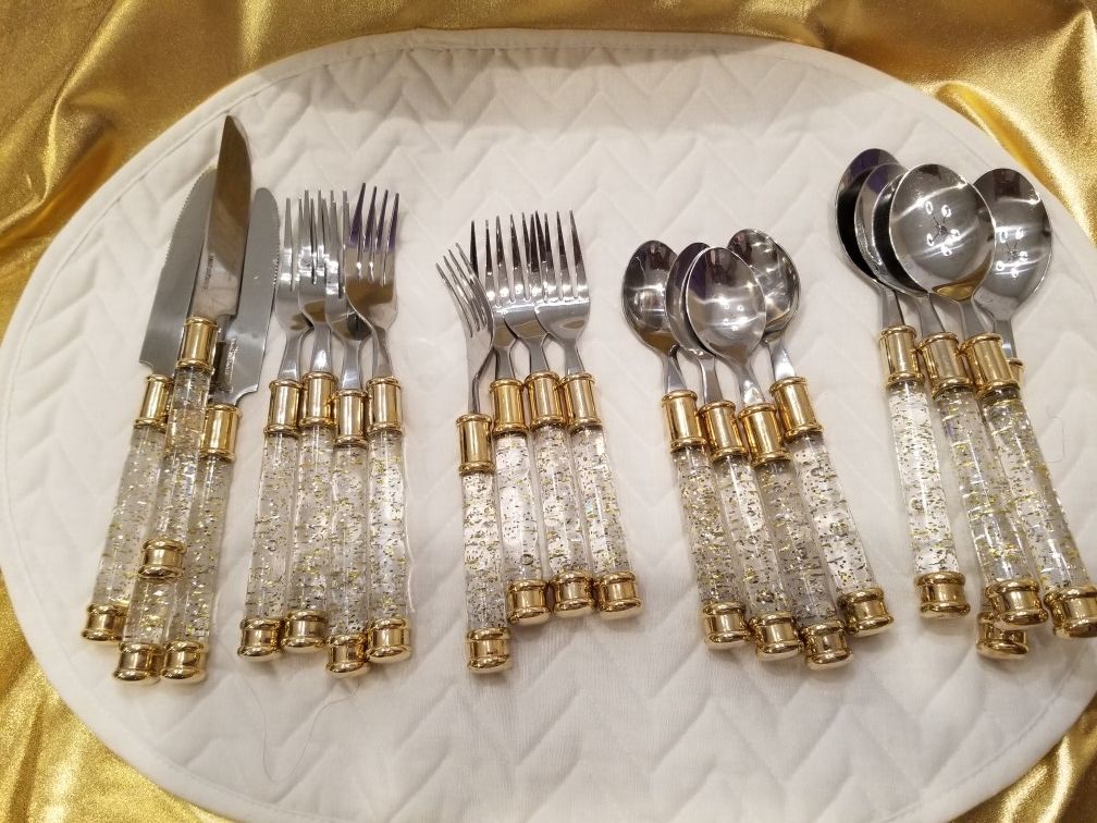 Stainless 20 piece Clear Gold Handle Silverware set with chips of gold in handle. Only used for decorating table. Never used. Excellent condition.