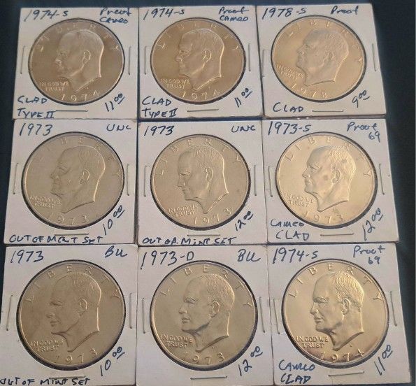 The exact coins pictured are the ones you will receive. Eisenhower or Ike Dollars from the 1970s. 9 total dollar coins. I do not believe any of these are silver. Affordable collectible coins. (3) 1973 Uncirculated (1) 1973-D Uncirculated (3) 1974-S Proof (1) 1973-S Proof (1) 1978-S Proof Price is for all of them OBO