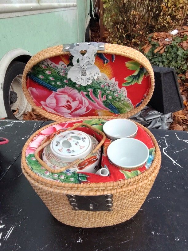 ANTIQUE CHINESE ROSE MEDALLION PORCELAIN PICNIC TEA SET PADDED WICKER BASKET NEW. Like new. Minor chip on inside of tea pot lid. Other than that it is 10/10. Pick up only.