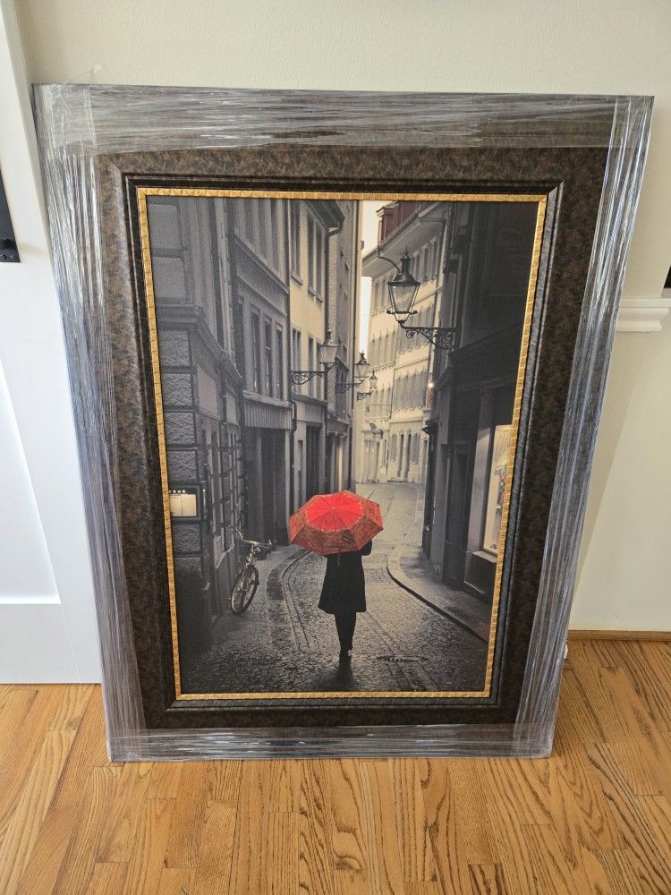 Picture Art Bronze Gold Frame 34x46 Girl Red Umbrella City Lamp Post