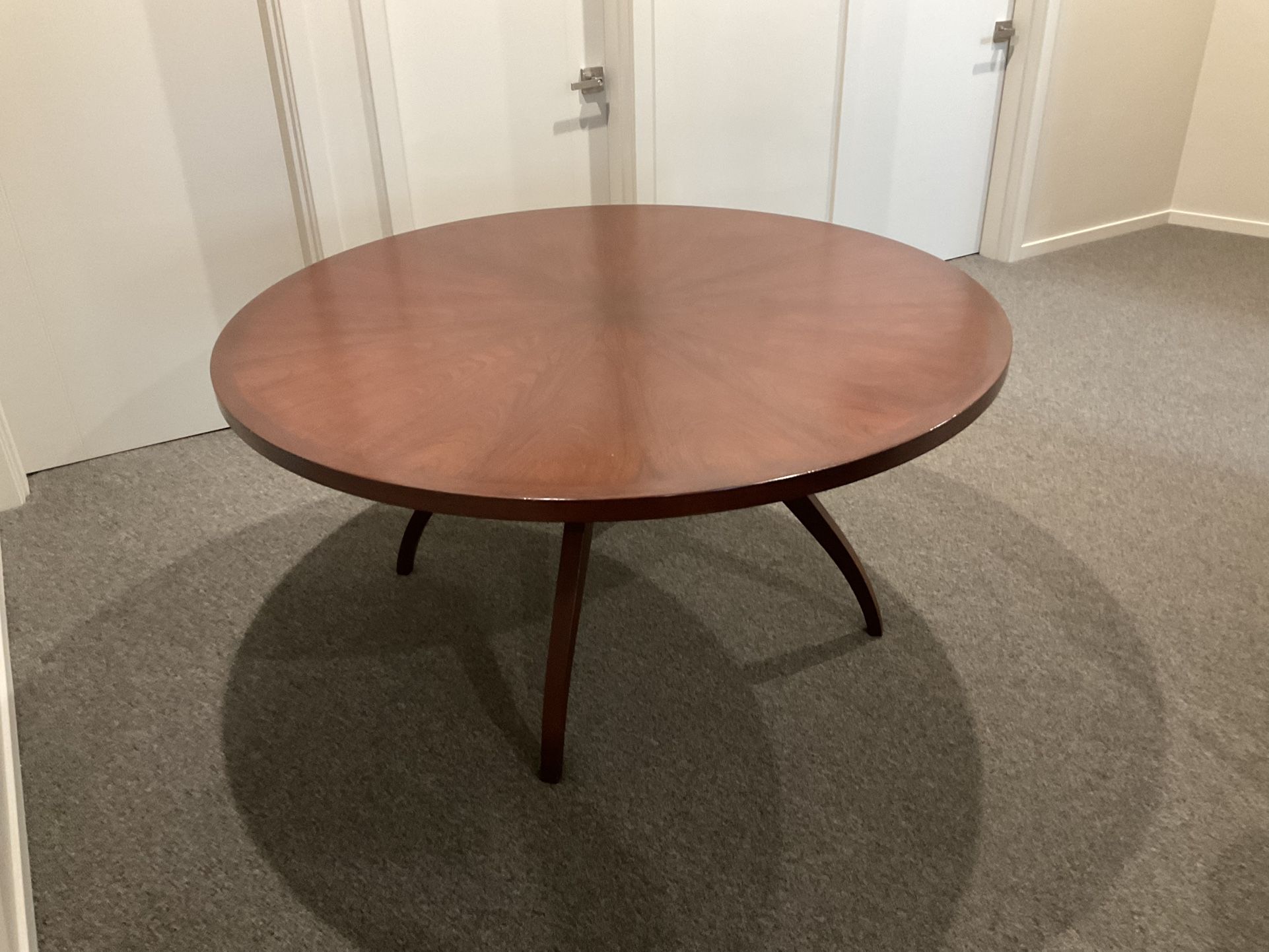 Vintage modern, custom made (about 1998 in Portland area), round dining table, 60 inch diameter. Table is wood with veneer top looks like Mahoney grain, finished reddish-brown. Top sits on four leg pedestal that can be detached for moving. Table is in good condition, but does have a few, barely visible, small minor dents and defects in top finish, see pictures. Top diameter is 60 inches, thickness 1.5 inch, height 28-3/4 inch. Table only, no chairs. Table top is heavy, requires two people to carry. Originally paid $5000 for table.