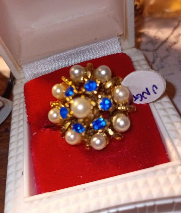 This Vintage Pearl and Sapphire stones looks like a big fireworks starburst. Beautiful starburst it's upon and adjustable band that is lovely. This rain is in very good condition especially for its age and I suppose it will be for a long time to come if taken care of. Please feel free to check out my profile cash word for more jewelry and other glove of the items I have to offer. Please refer to pictures for further details on this ring. And it must be able to pick up items in Lakewood.