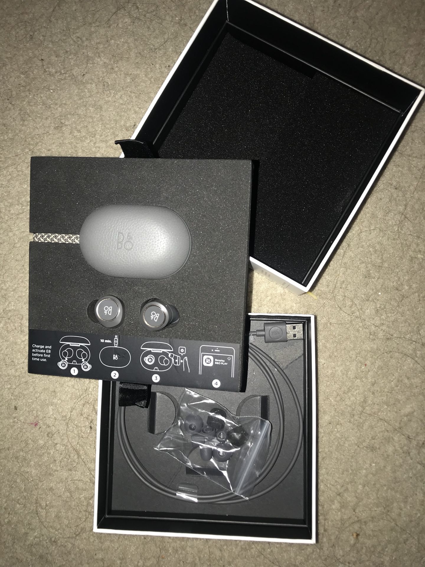 Beoplay E8 Headphones in Charcoal Black Bang & Olufsen Signature Sound Never used Brand New Condition Comes with Charger 4 hours of play time on one charge Transparency mode Touch Interference High Quality Sound Premium Durable Material