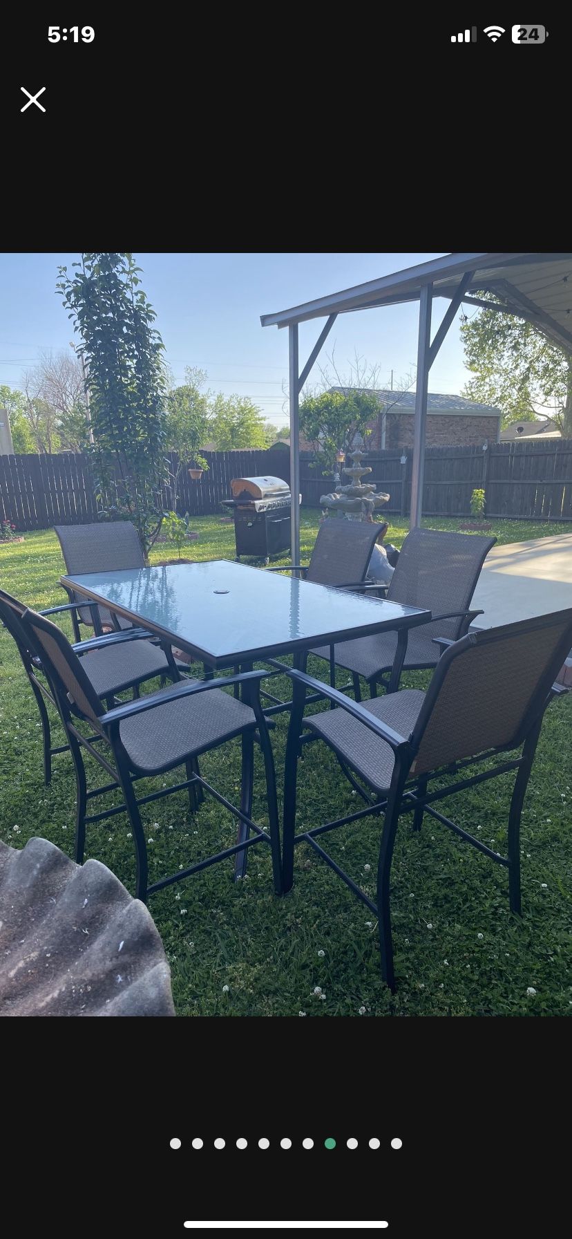 I have almost new patio table glass top 62inches wide 36 tall extra clean 6 chairs have pick up 34 th st garnet Tulsa