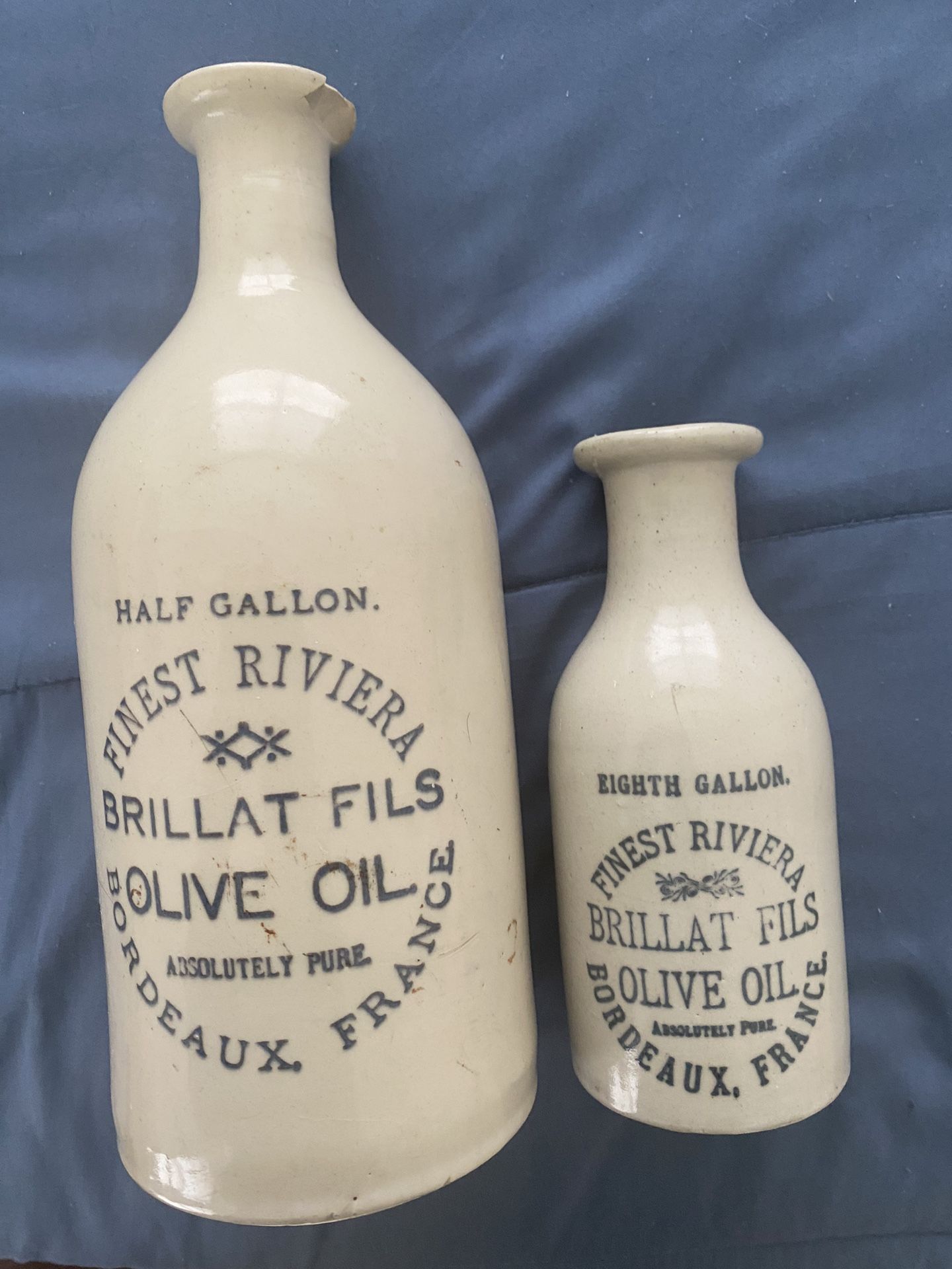 One Half Gallon & One Eighth Gallon Olive Oil Bottles. Stoneware, one has a chip on top. There heavy! Shoot me an offer?
