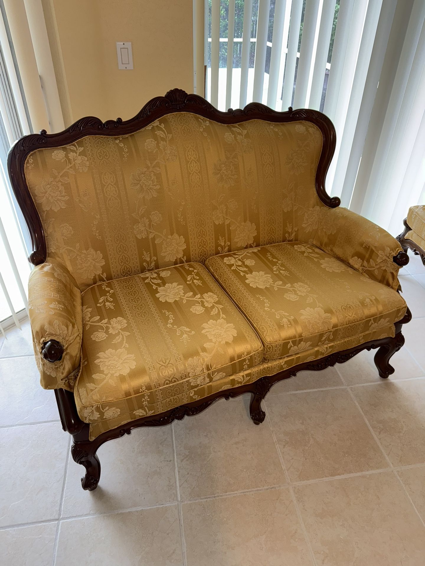 Beautiful hand-carved mahogany wood furniture from the Philippines, featuring luxurious brocade upholstery with a classic floral design. β¨ Condition: Unused β cushions have never been sat on. The furniture has been carefully kept covered with cloth blankets since purchase. πͺ΅ Material: Solid mahogany wood (rich, deep tone, sturdy construction) π Includes: β’ Sofa: 76β³ L Γ 36β³ W Γ 44.5β³ H β’ Loveseat: 57β³ L Γ 36β³ W Γ 44.5β³ H (seat height 19β³) β’ (2) Armchairs: 37β³ L Γ 32β³ W Γ 42β³ H each β’ Coffee Table: 45β³ Γ 45β³ Γ 17.5β³ H π° Original Price: $9,000 brand new (purchased in 2000) This is a timeless, high-quality set that adds sophistication and charm to any home. Perfect for a formal living room, sitting room, or anyone who appreciates fine craftsmanship. π Local pickup only