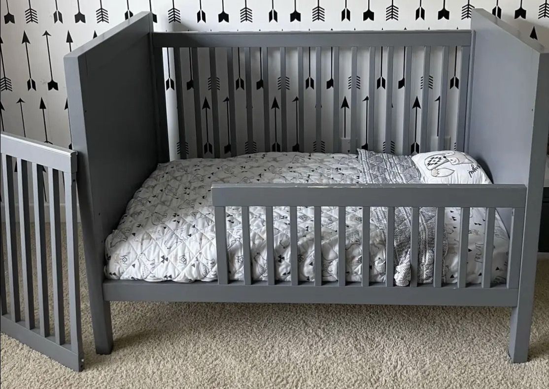 This crib is in great condition. There is a single toddler attachment that is a little “chewed” up. The tall regular crib attachment is in perfect shape. Very sturdy and it looks great.