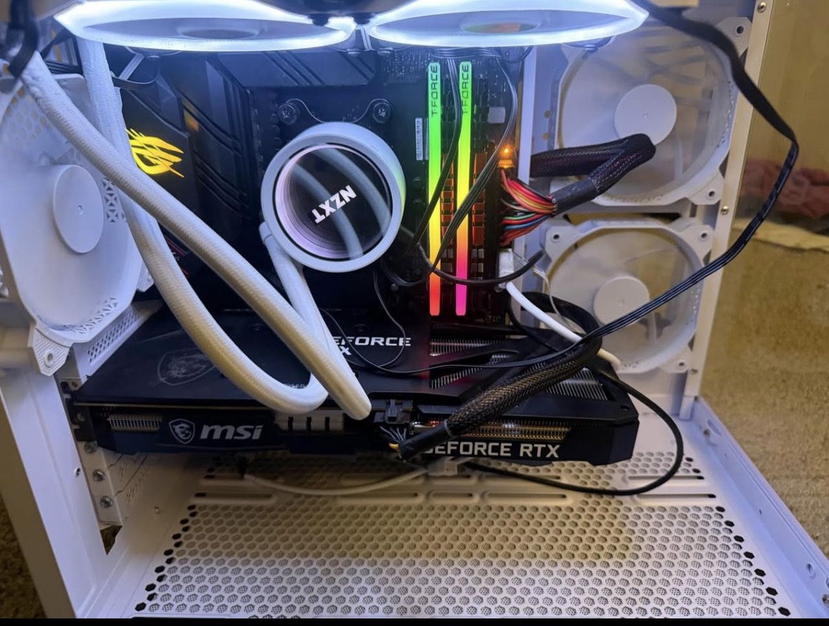 white pc case cpu ryzen 5 5700x gpu 3060ti cpu cooler nzxt AIO cooler (liquid cooler) 1.5 TB of storage 500 watt power supply 48Gb of ddr4 ram at 4400mhz