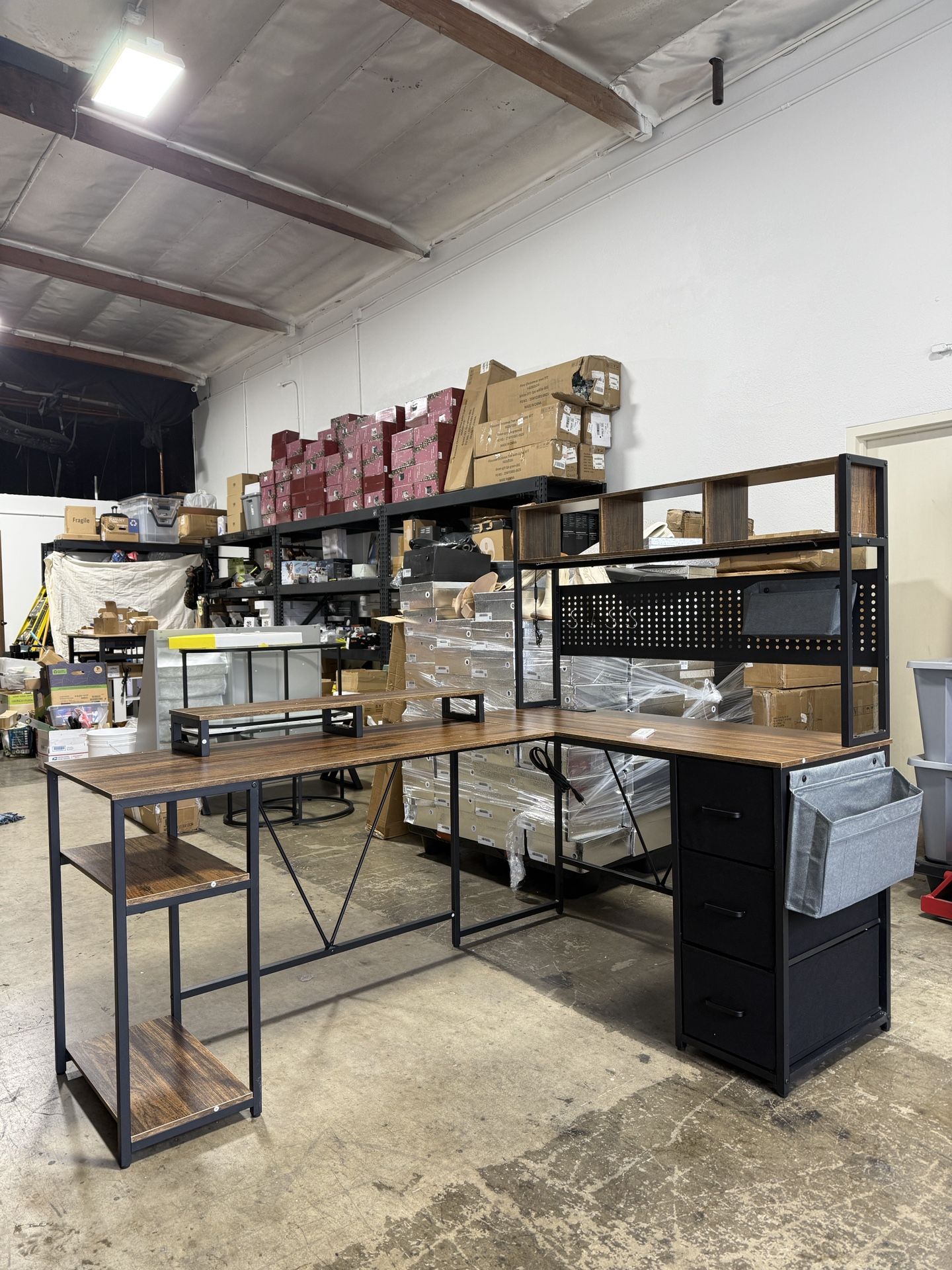 Reversible L Shaped Desk with Storage & Pegboard, 67'' Large Gaming Desk with Led Lights, Corner Computer Desk with Drawers & Power Outlets, Home Office Desk Gaming Table Desks with Shelves, Woodcolor