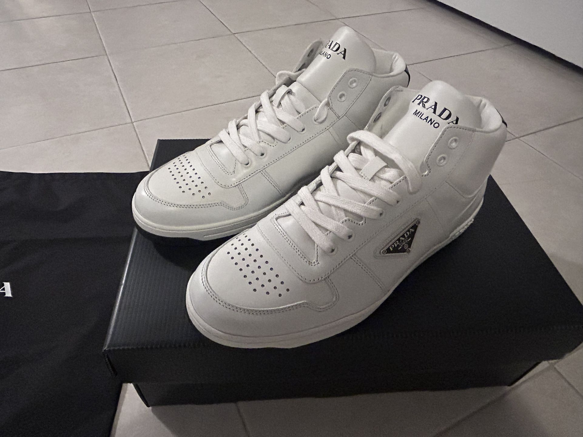 - 100% Authentic, purchased directly from official retailer - Never worn, - Model: Prada 4T3368 White Leather High-Top - Size: EU 42 (US 9) - Retails for $1,100+ on Prada and luxury retailers - Ships from [City, State] - fast shipping with tracking DM me for more info or pics!