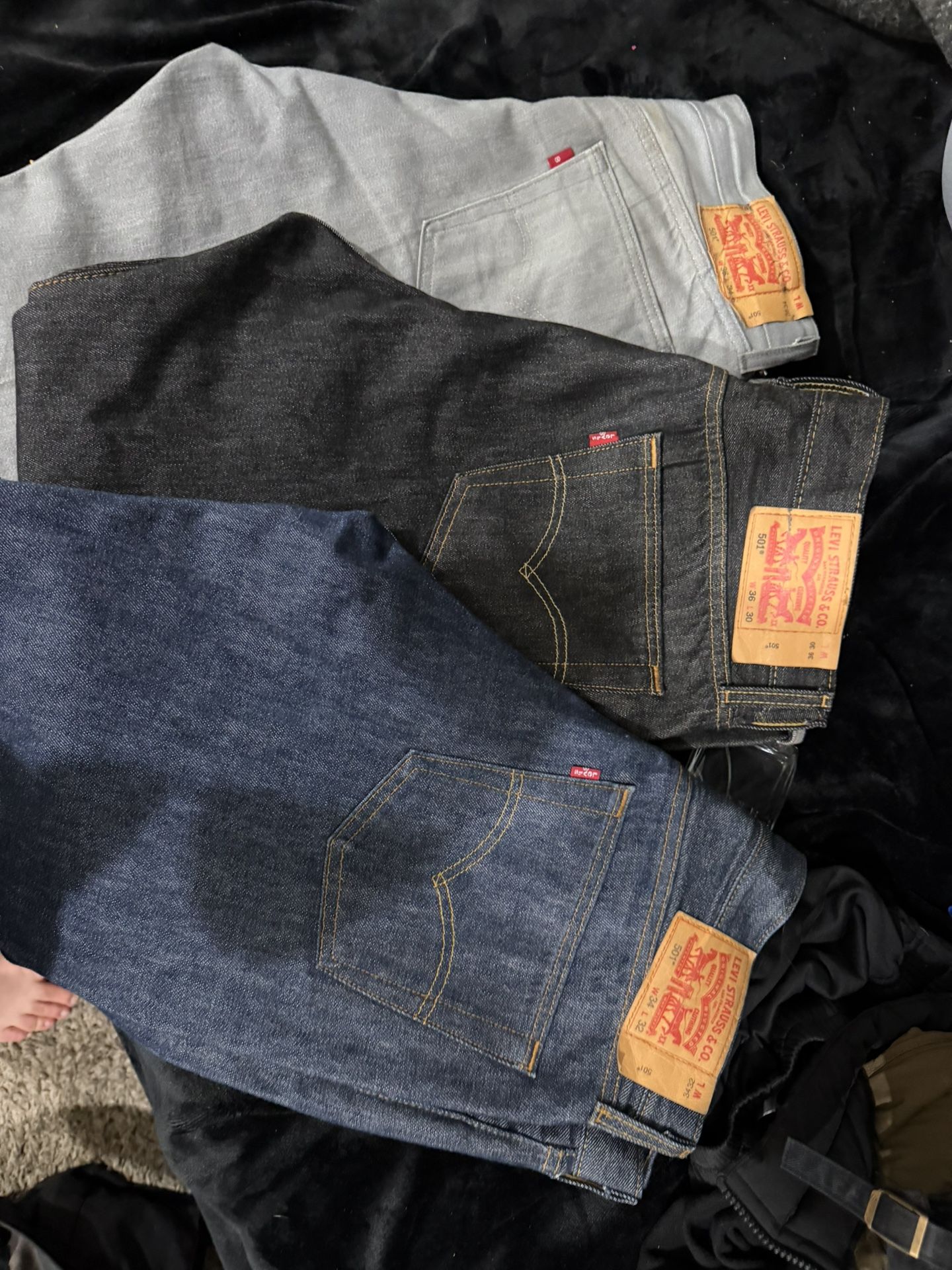 Blue rigid Barley used size 34-32 Grey 501s used couple stains but not visible size 36- Charcoal Brand New One Stain size 36-32 100 For all Or trades for flared jeans ❗️ 35 each pair