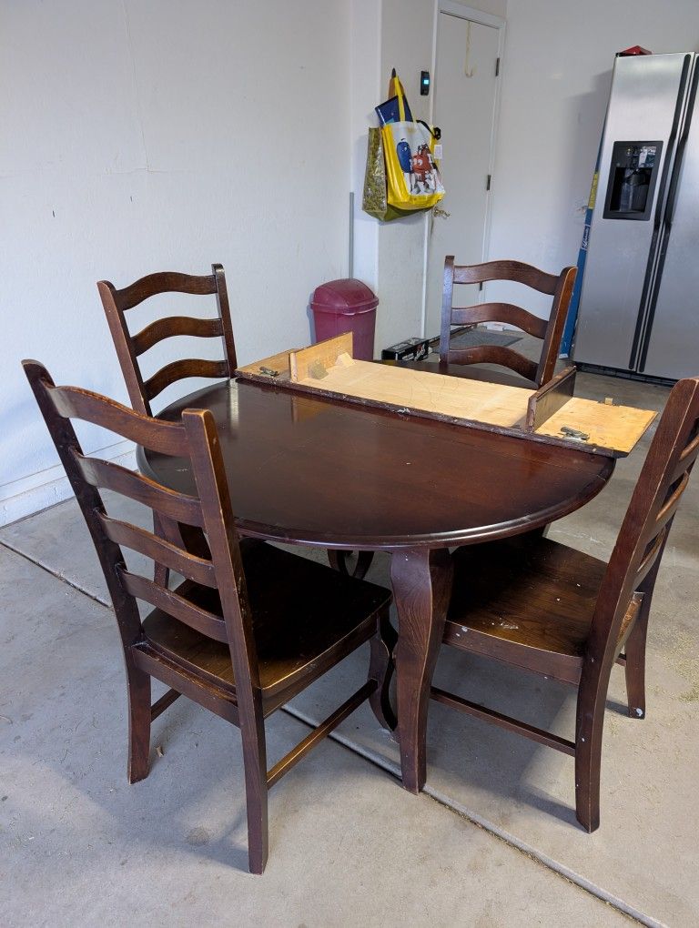 Very sturdy, well made dining table with leaf. The table has normal wear and tear and would clean up/restore very nicely if desired. Pick up only. 4 chairs, leaf, and table included.