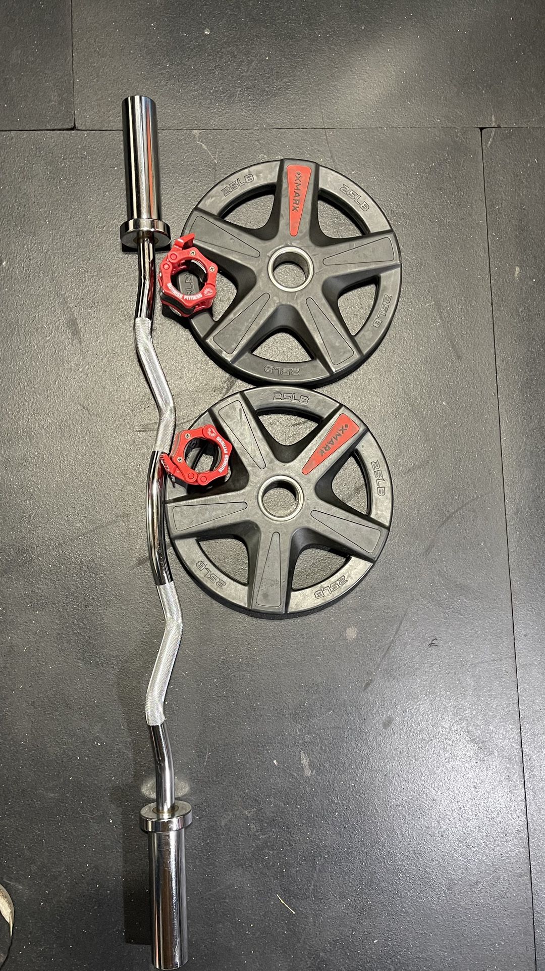 Normal use in good condition pair of 25s rubber coated Olympic Weights with a brand new heavy duty Olympic curlbar, with a pair of brand new clamps. Asking $130 firm !!!!LOW BALLERS WILL BE IGNORED!!!