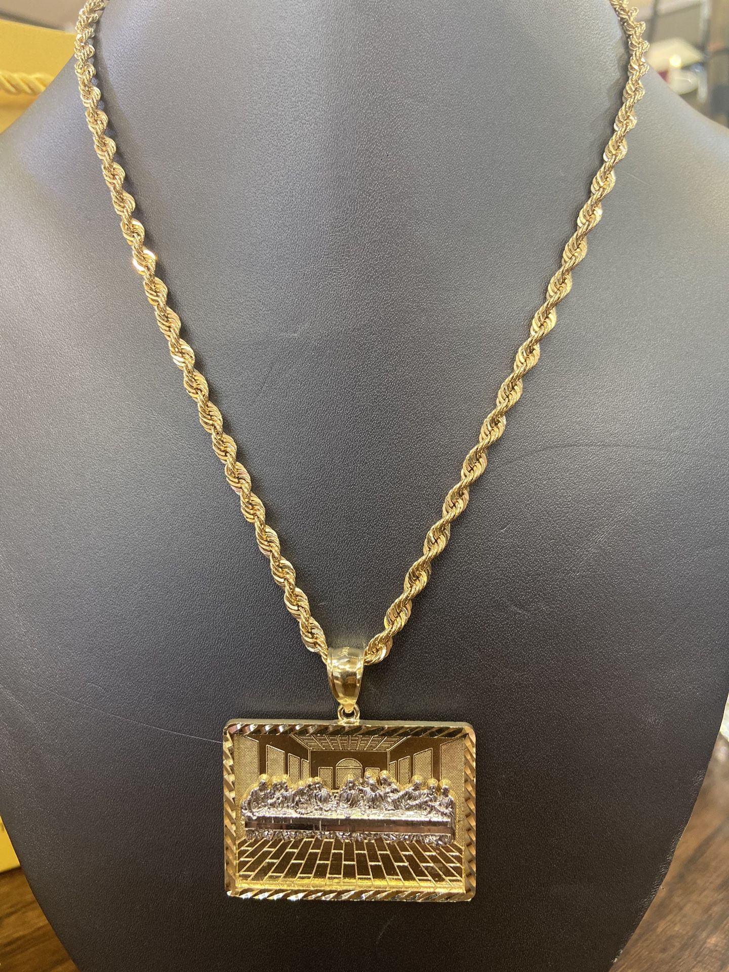 10kt gold two tone last supper charm with 10kt rope chain Financing available no credit check with $70 down take home 90 days option available. 12 months no interest also available for qualified credit customers, score above 675. Also, layaway available with 10% down.