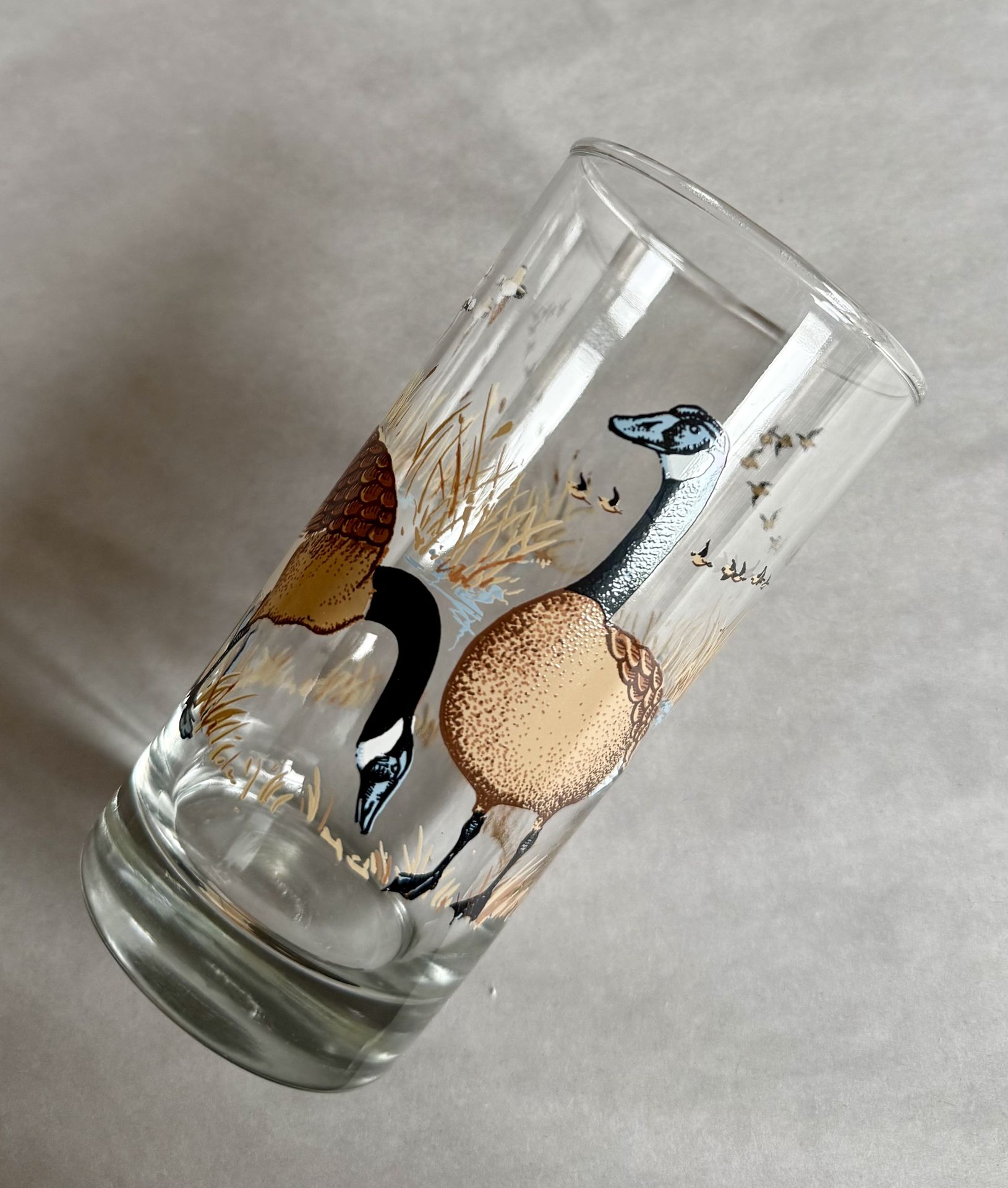 Vintage Anchor Hocking drinking glass decorated with Geese and designed by artist Triguba. Glass is in excellent condition and shows little (if any) signs of previous use. 12-oz liquid capacity. Measures 5.5 inches tall and 2.75 inches in diameter.