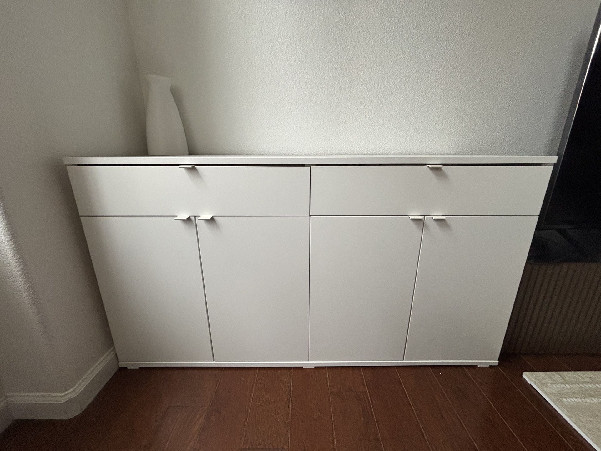 selling an IKEA BESTÅ white storage sideboard/cabinet with doors and drawers. Approximate size: ~55″ W × ~18.5″ D × ~29.2″ H Overall great condition with no visible flaws, scratches or dents — clean and well maintained. Interior shelves and doors work perfectly. • Spacious storage behind doors • Solid and stable design • White finish fits many décor styles • Pickup only in Santa Clara, 95054