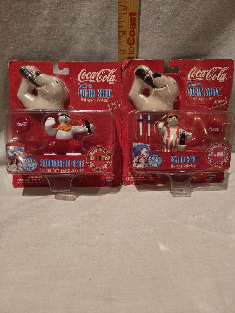 These two vintage 1998 "Coca-Cola" polar bear wind-up polar crew figures, with moving parts,one is "Skiing bear", the other one is " Snowboard bear" !! Both are in original packaging which show some wear from age. See pics.