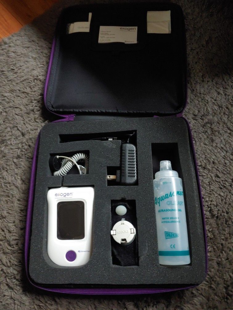 Brand new exogen bone healing system complete with life time warranty and ultrasound gel. Charger everything is in case also phone numbers for warranty.