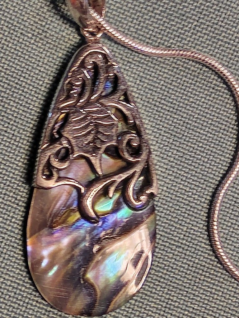 (NC-808094) GORGEOUS ABALONE IS HELD BY LEAF AND VINE MOTIF STERLING SILVER. SUSPENDED ON A STERLING SILVER 18 INCH CHAIN.